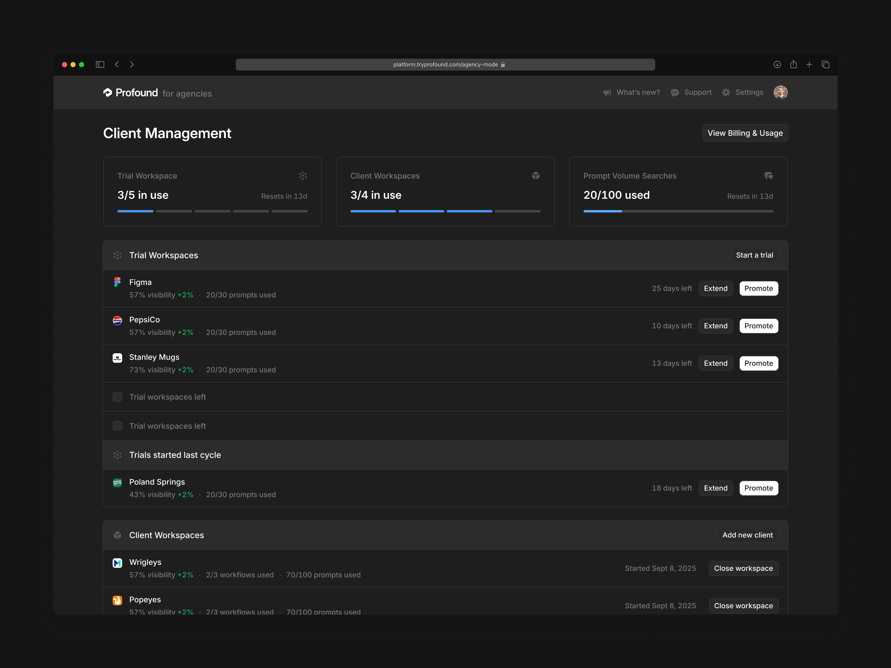 With Agency Growth, you consolidate your usage and expenses with Profound into one bill. Never lose track of multiple subscriptions.