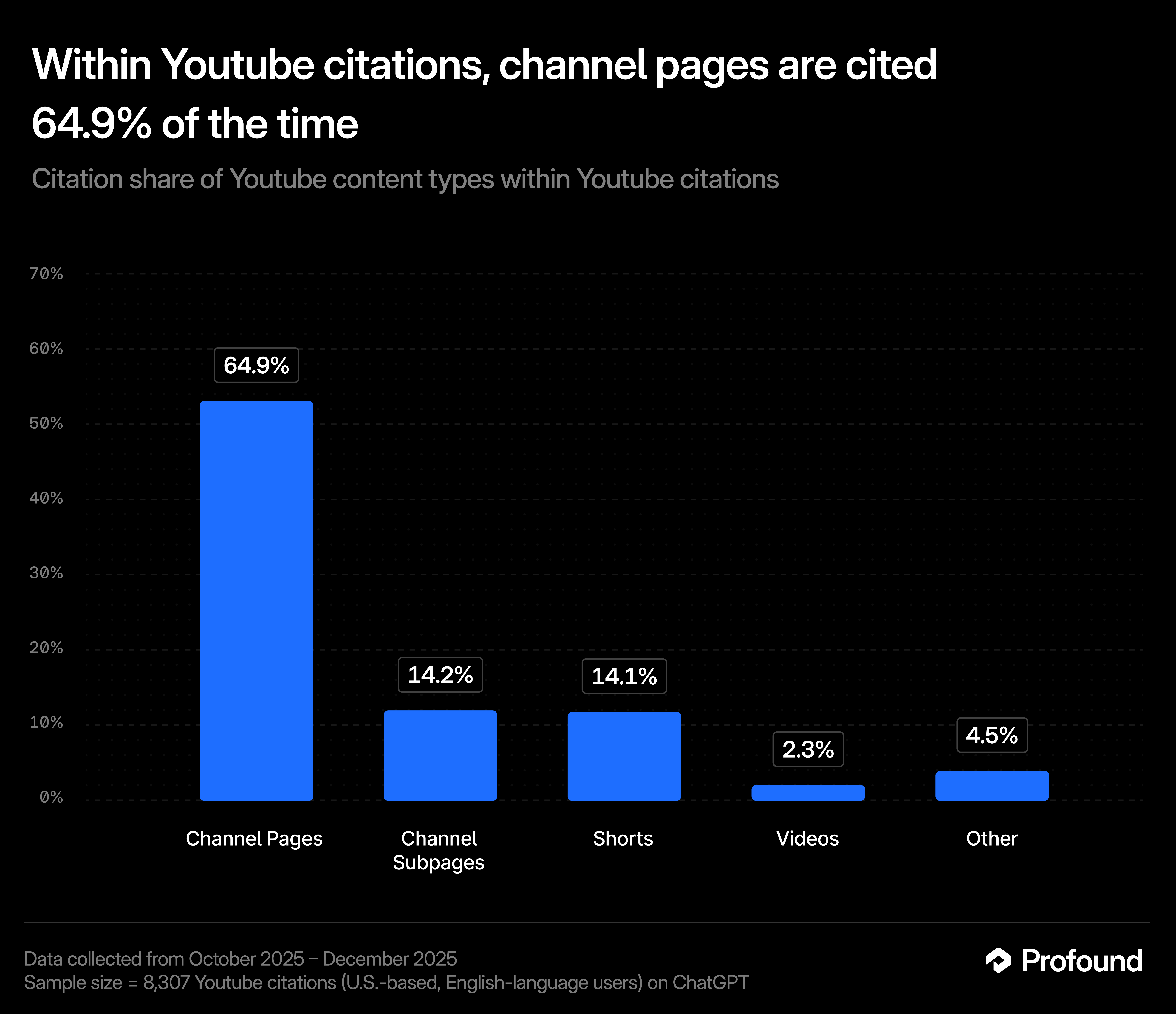 The insight: YouTube citations in ChatGPT are about creators, not content. When ChatGPT cites YouTube, it's citing a channel page 65% of the time not a specific video (just 2.3%). Channel subpages (the /videos, /shorts, /community tabs) add another 14%. Combined, channel-level citations account for nearly 80% of YouTube's total.