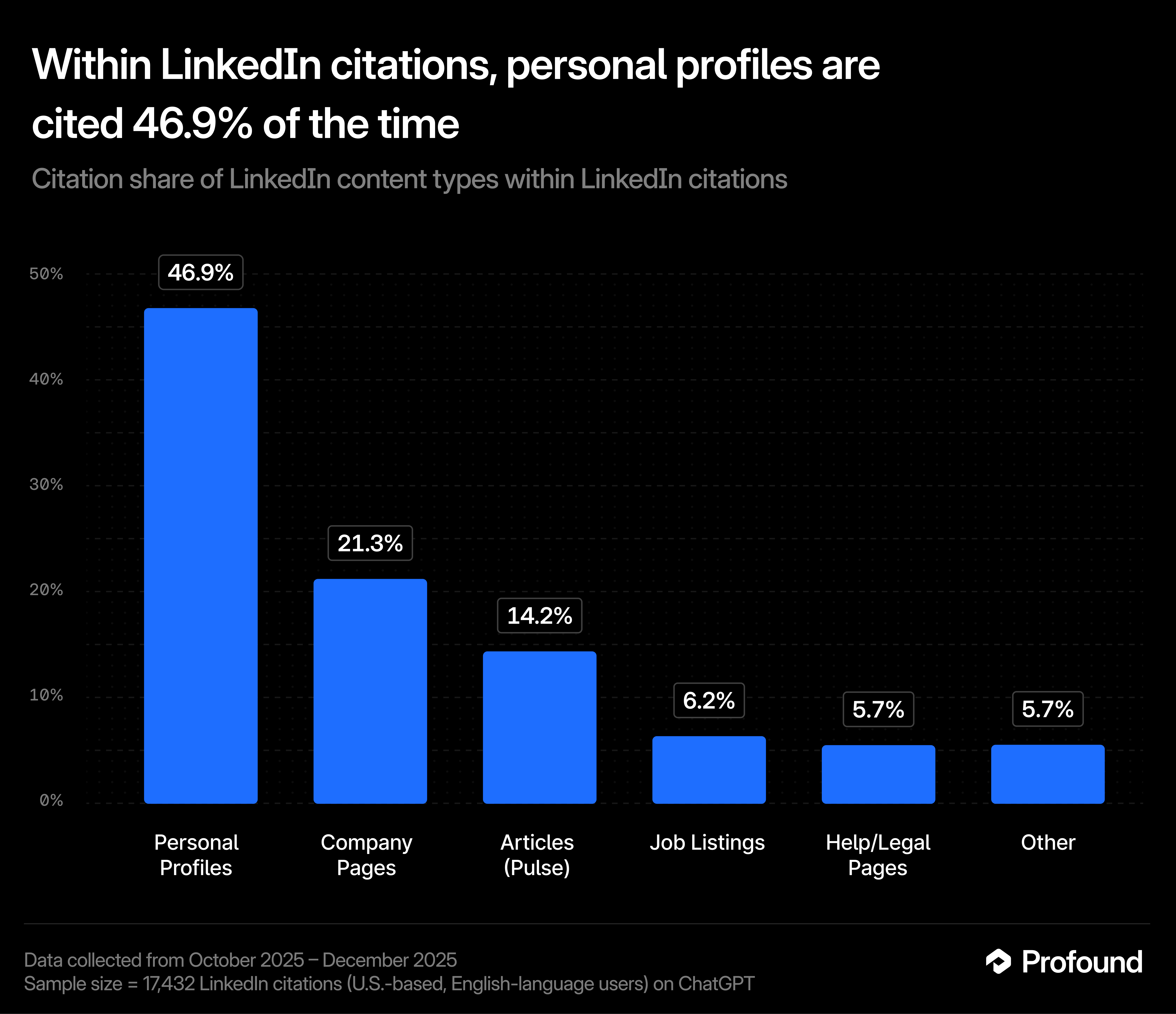 The insight: Personal profiles drive nearly half of LinkedIn citations, more than double company pages. LinkedIn articles (the "Pulse" platform) capture 14%, suggesting written content matters, but individual authority trumps corporate presence.