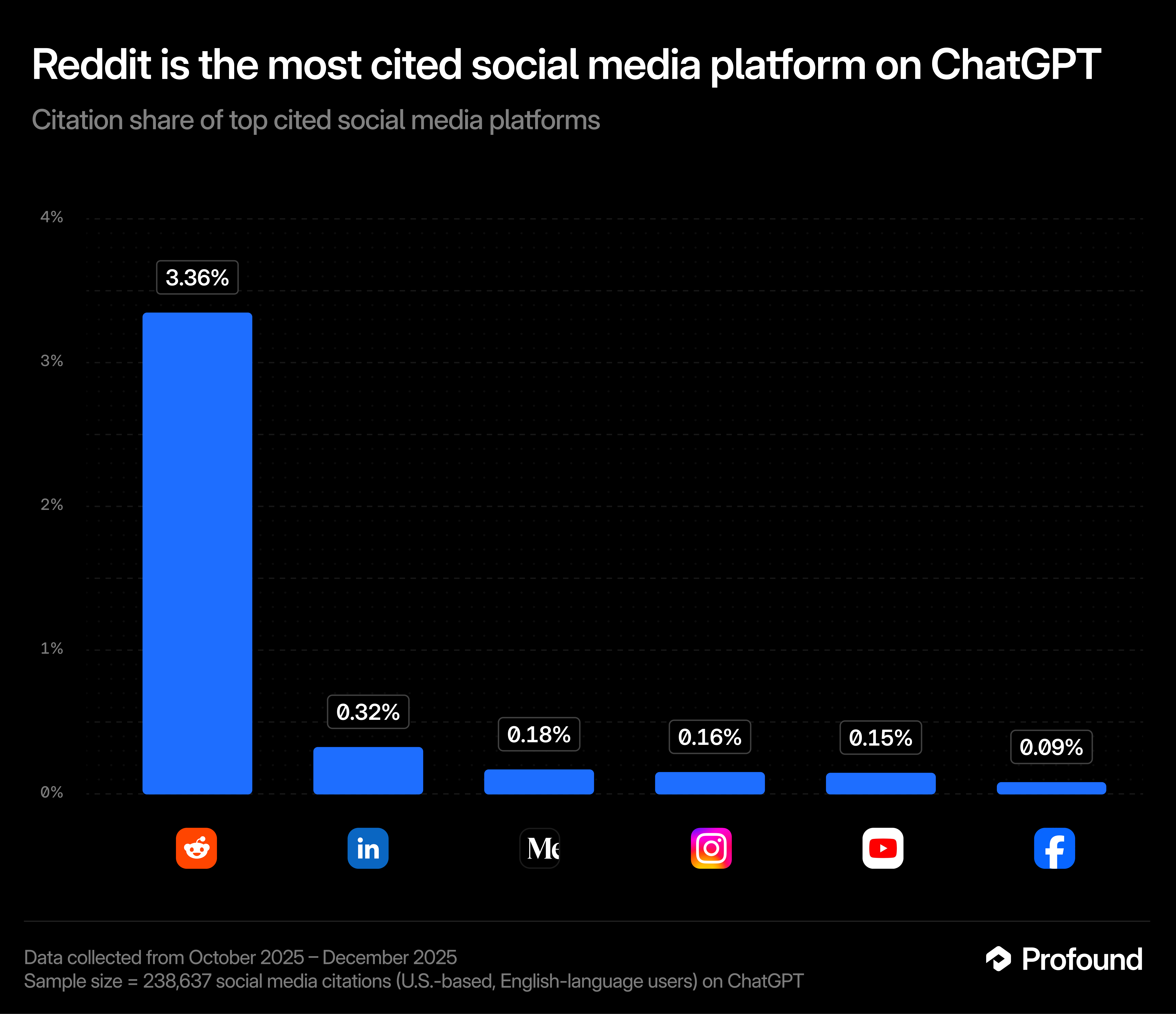 We analyzed approximately 238,000 social platform citations from ChatGPT responses (October 2025–December 2025, U.S. English users) to understand which platforms win, how they get cited, and what it means for brands deciding where to invest their community-building efforts.