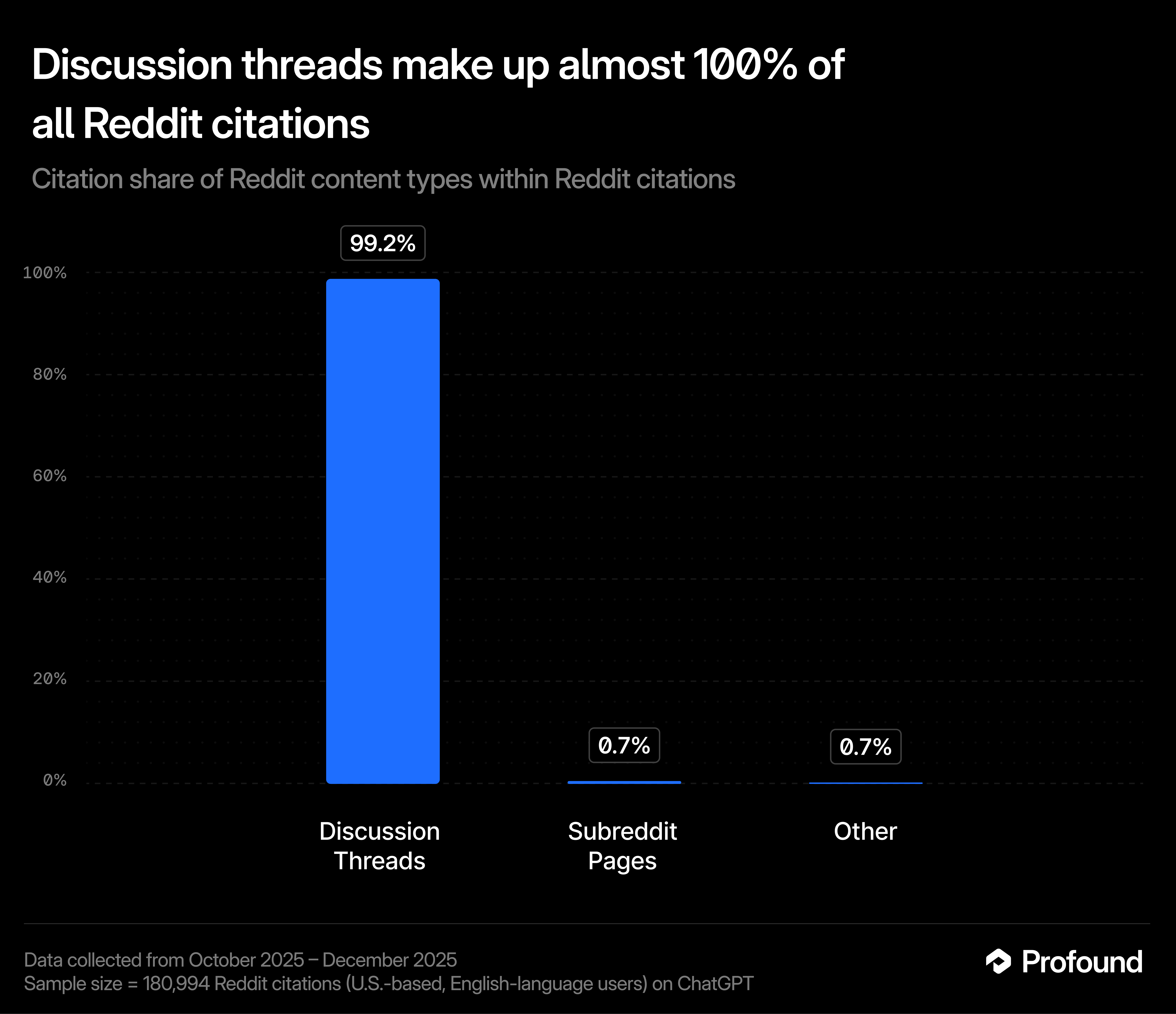 The insight: Reddit's citation power lives entirely in specific discussions/comments. Subreddit homepages, profile pages, even Reddit's corporate pages are citation footnotes.