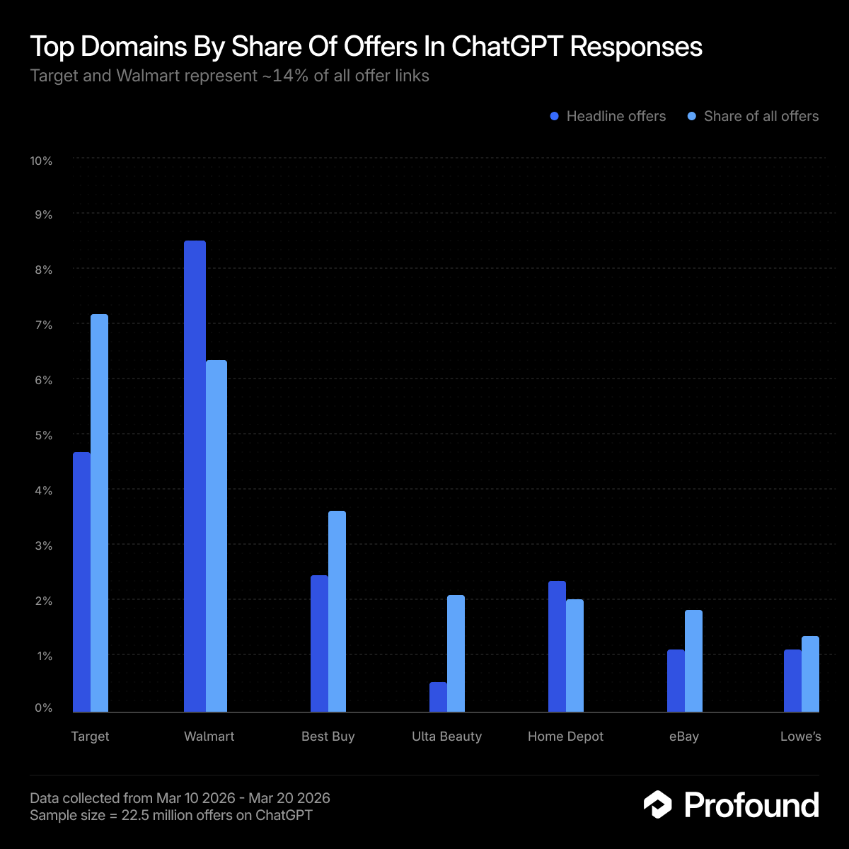 The headline vs. all-offers flip is the most interesting thing in this data. Walmart takes the top slot at 8.78% against Target's 4.93% — nearly 2:1. But Target leads total offer presence (7.16% vs 6.54%). Target shows up roughly three times more often as a secondary offer than as the headline. ChatGPT reaches for it constantly as an alternative, just rarely as the first recommendation. Walmart is the opposite: it punches disproportionately in position one.