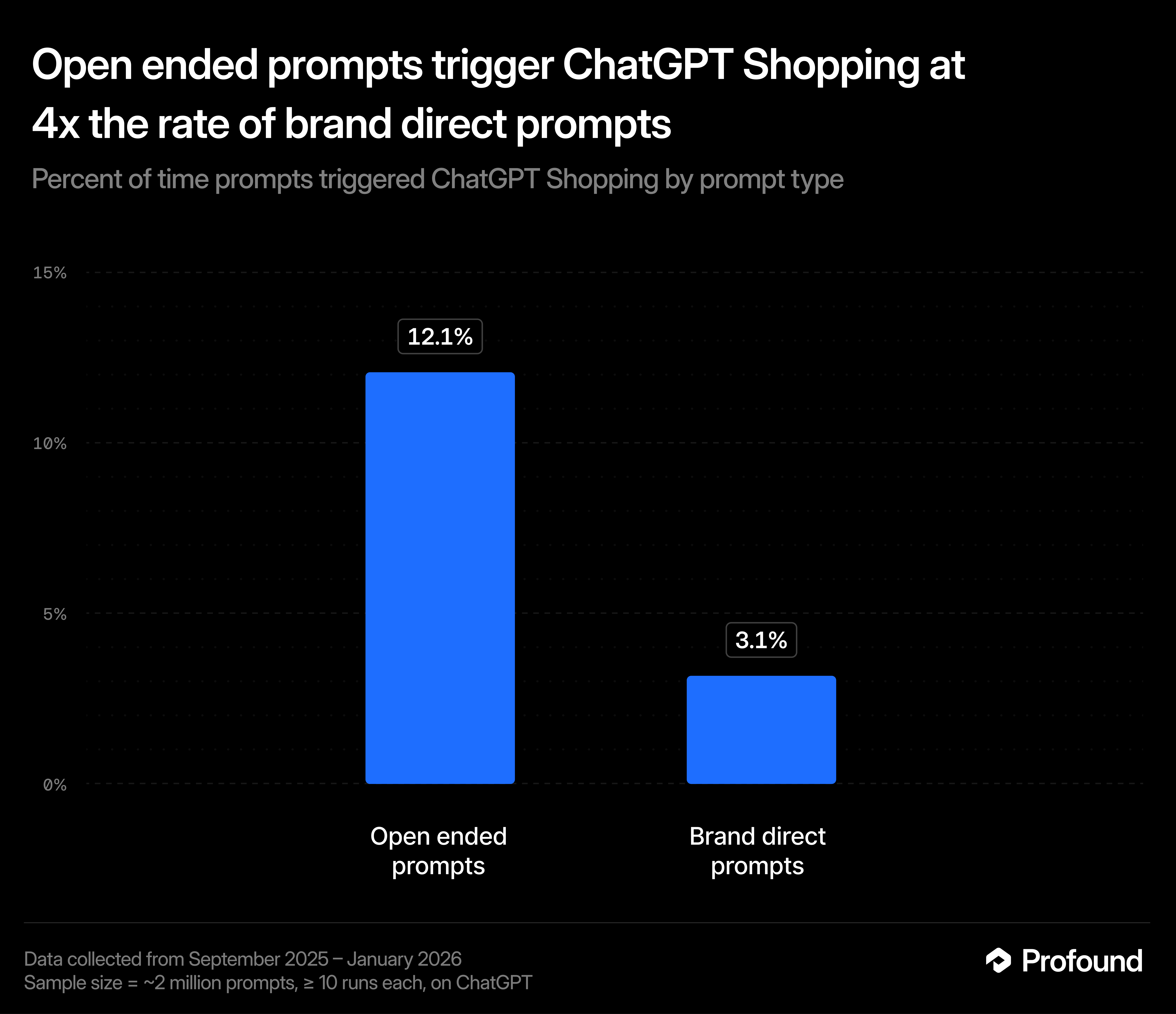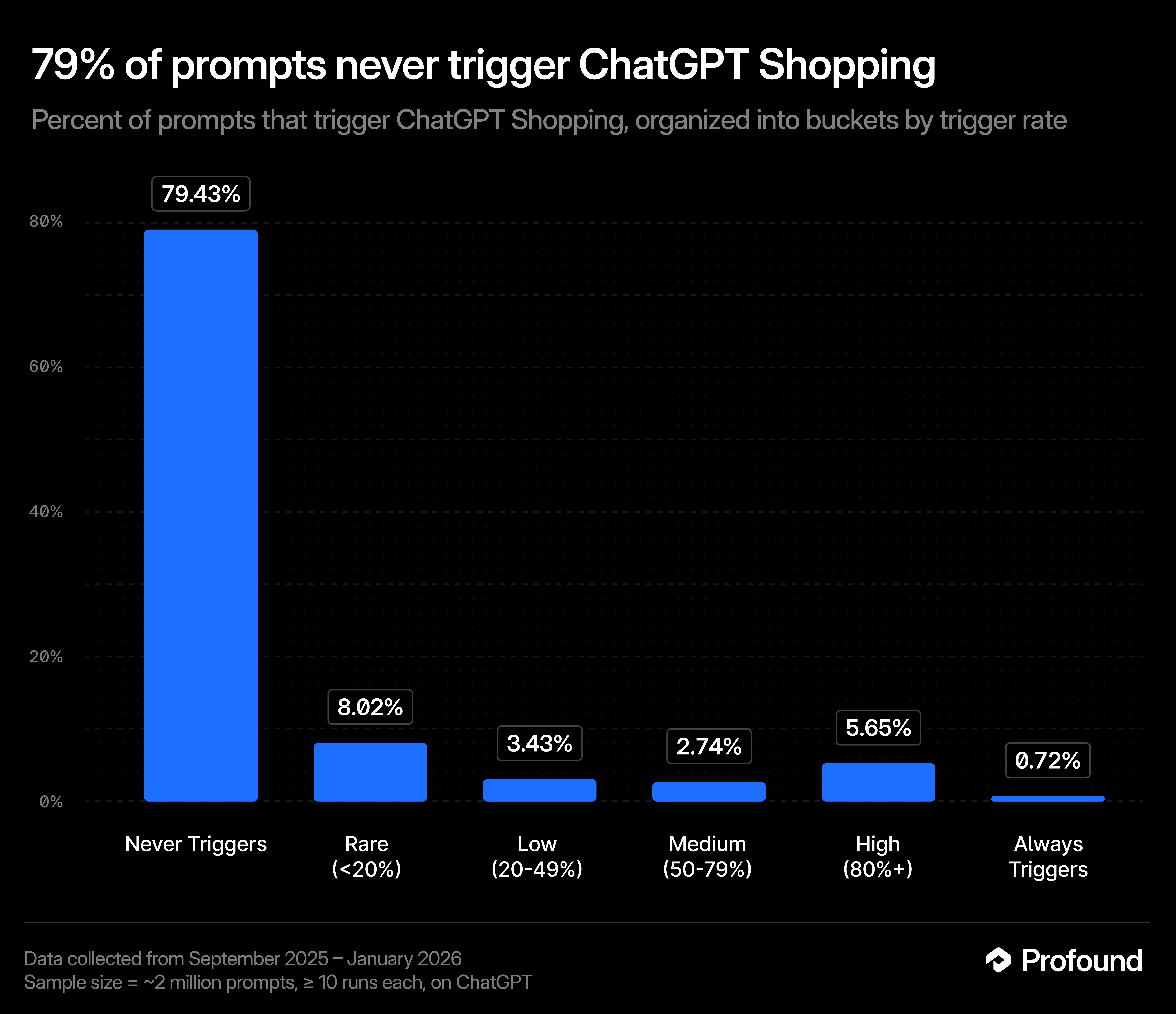 We tracked ~2 million unique prompts repeatedly over several months from September 2025 through January 2026. We aimed to measure not just whether shopping triggers, but how consistently it triggers over time.