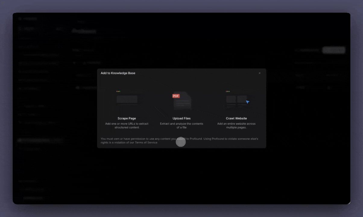 Knowledge Bases solve this by providing Profound Agents with a single source of truth for everything related to your brand. When teams upload company docs, webpages, or sitemaps to their Knowledge Base, it allows Agents to pull the right company-specific context every time they perform a marketing action.