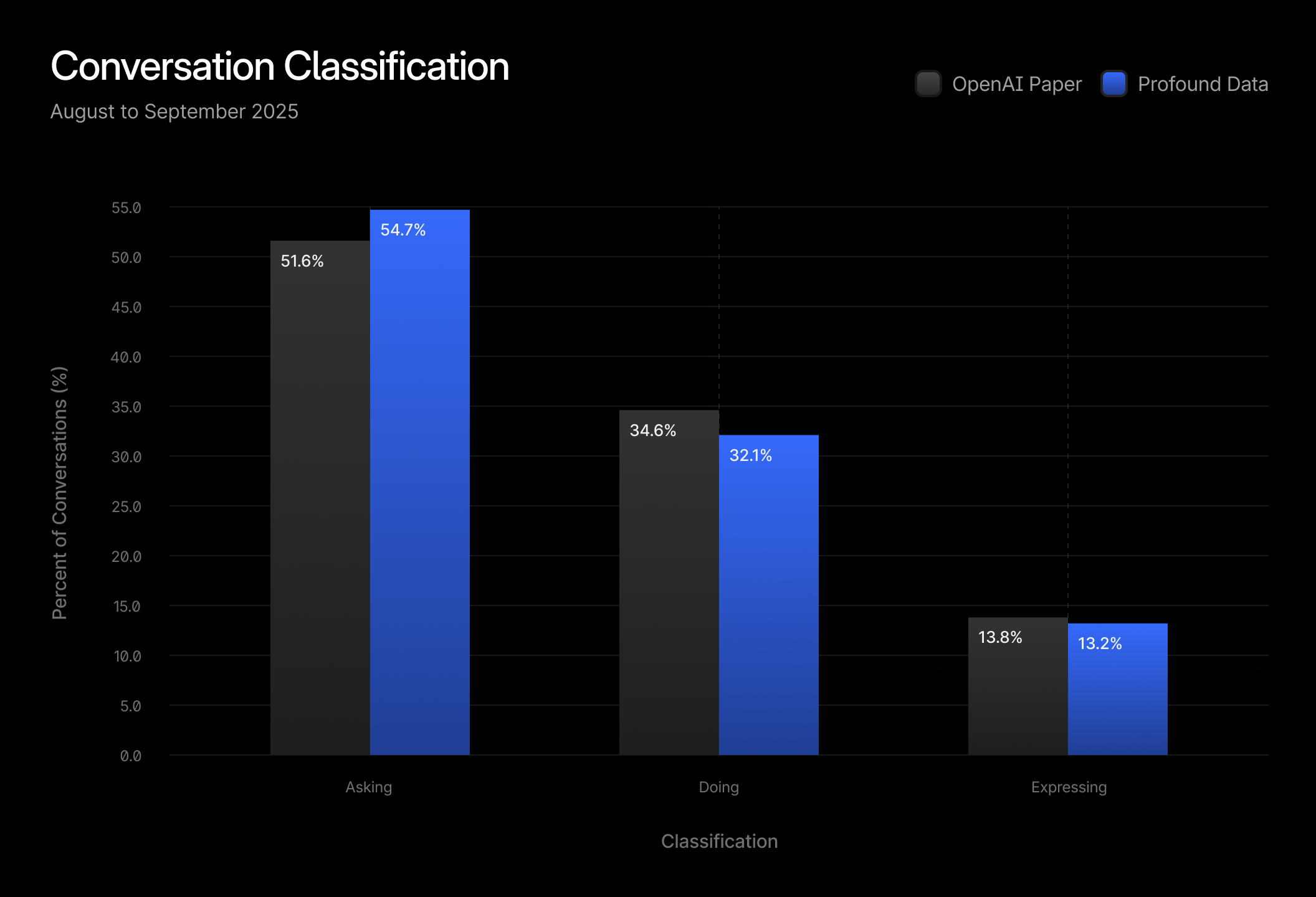 This replication was more than a sanity check. The OpenAI paper captures the true production distribution of LLM usage, and by matching our results to it, we confirmed that third-party data reflects real-world patterns. That validation means our insights, and the analyses our customers rely on, are grounded in reality, giving clients confidence that shifts in prompts or topics reflect genuine user behavior, not data artifacts.